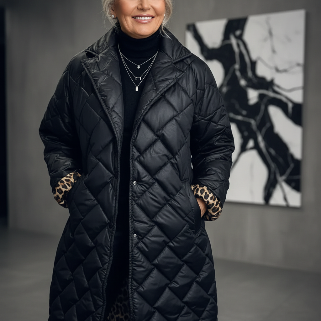 Warm, flattering, and effortlessly elegant. The Alina Coat features a classic quilted exterior with a reversible leopard-print lining for an extra touch of personality. Soft padding keeps you cozy without bulk, and the mid-length cut offers beautiful, comfortable coverage for everyday wear.
